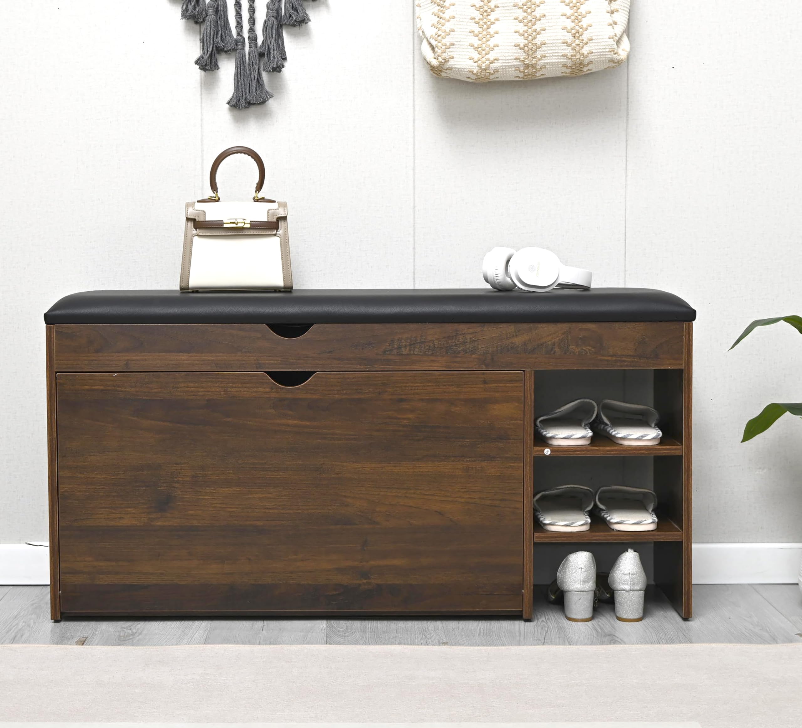 Premium Homeiz 3-Tier Shoe Storage Bench: 110 CM Wide Wooden Shoe Rack with Pull Down Drawer, Entryway Shoe Bench, Shoe Storage Rack with Faux Leather Seat,